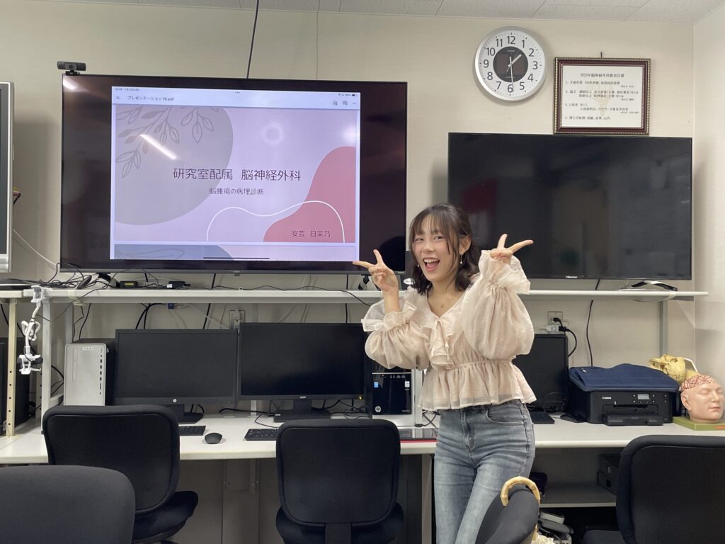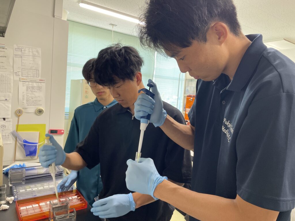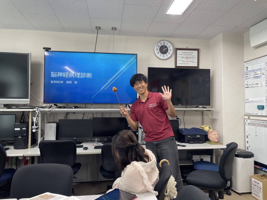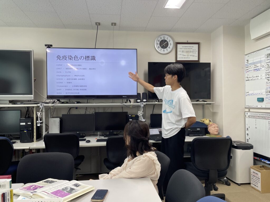 3年生の安芸さん、西出くん、高くん、前田くんが脳神経外科を選んでくれ、脳腫瘍の免疫組織実習を行いました。皆さん基礎医学で勉強してきているだけあって、楽しく頑張ってます。比島さん(技官)の元、短期間ですが腫瘍の病理診断のための免疫染色を学習し、発表は東野先生が見てくれました。良いドクターになってください。