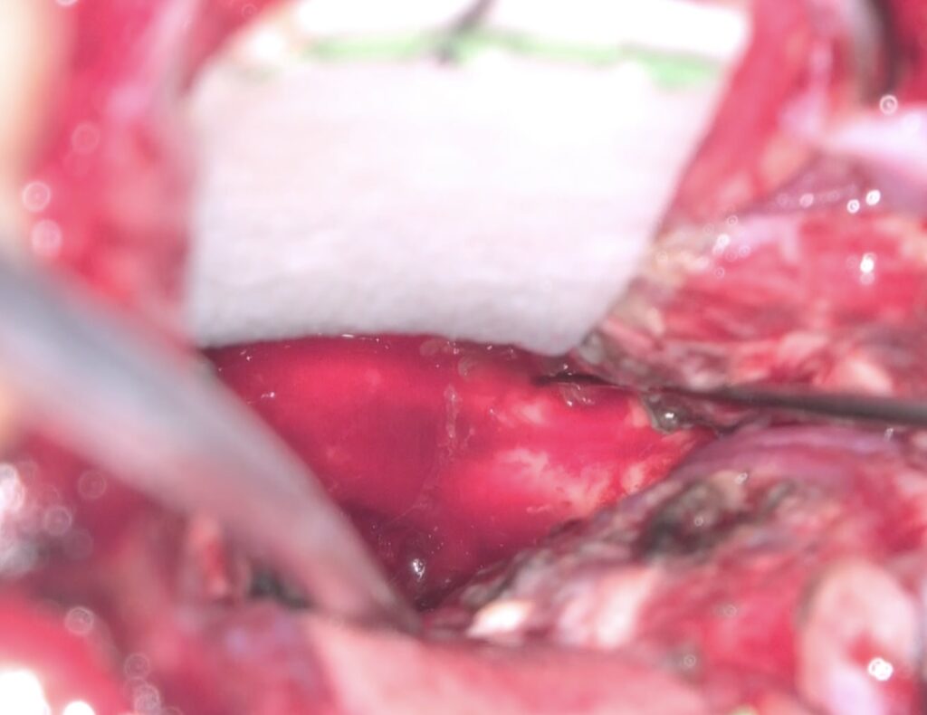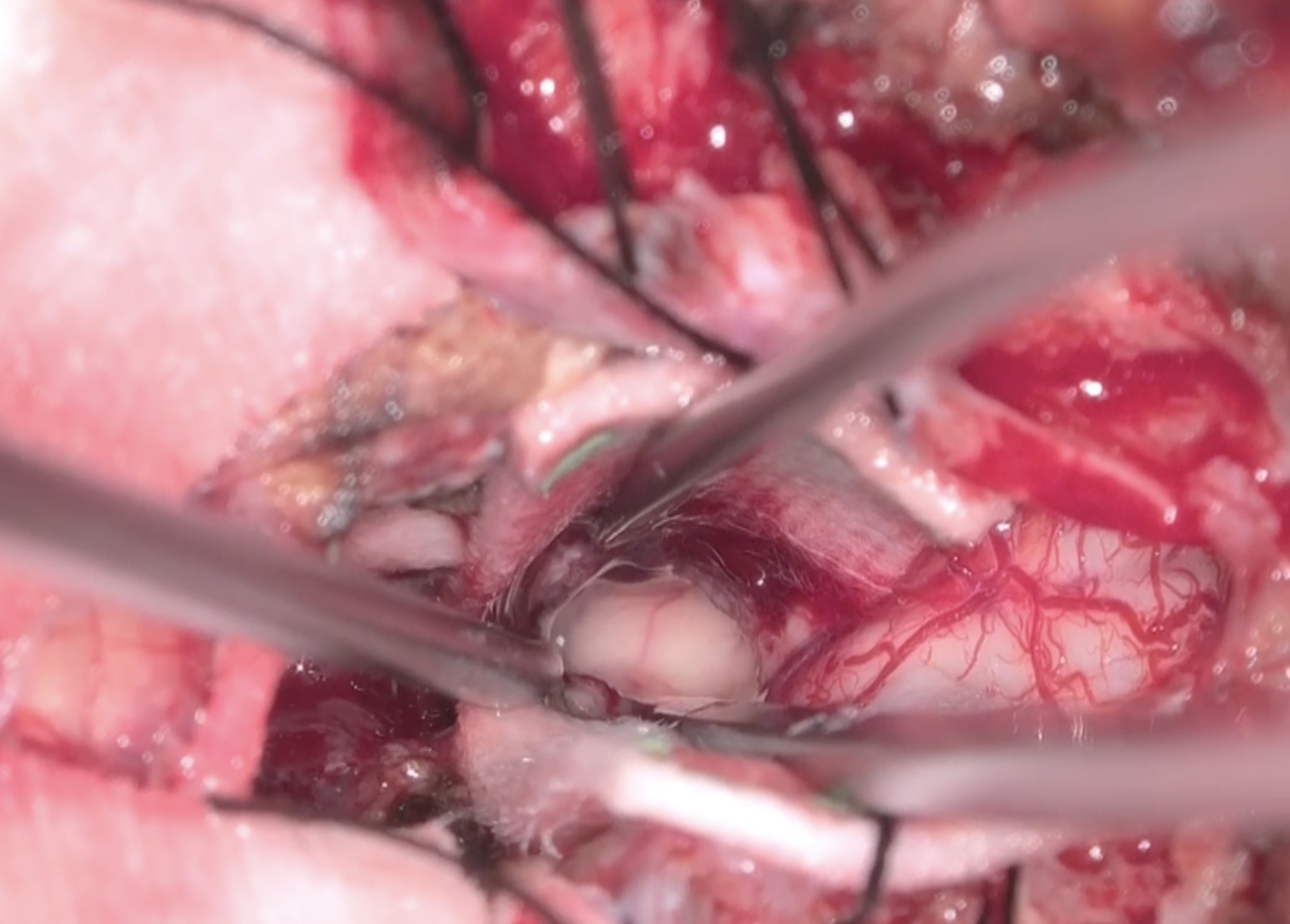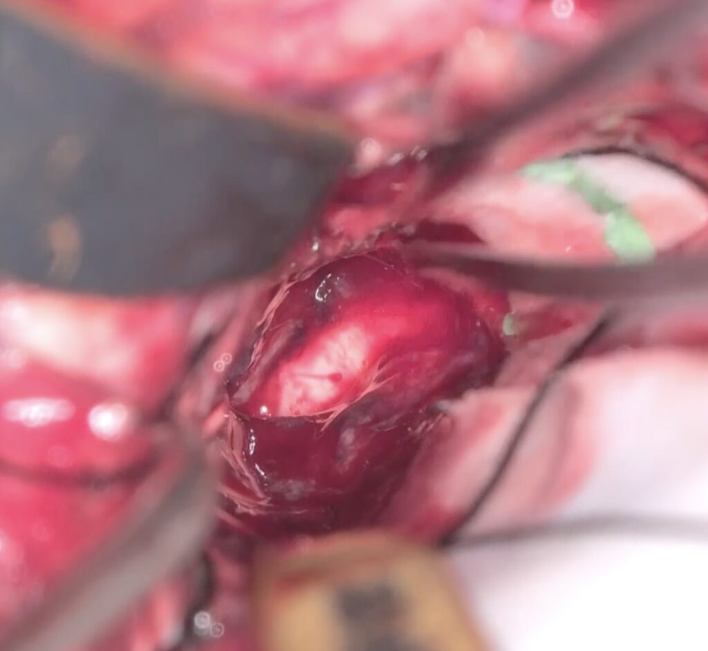 頭痛と歩行障害で発症した脳腫瘍で、緊急脳室ドレナージを行い、画像診断を進めました。髄芽腫の疑いが強かったため正中後頭下開頭で準緊急で手術を行いました。腫瘍は易出血性ですが、第四脳室底は損傷せずに摘出できたと思います。