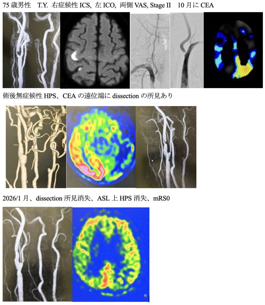 251021火 75歳男性、左内頸動脈閉塞、両側椎骨動脈狭窄を伴う右内頸動脈狭窄症に対してCEAを行いました。 2026 1/23 内頸動脈狭窄 2025年12月11日2026年1月23日多発狭窄で血行力学的脳虚血も合併している脳梗塞発症の右内頸動脈狭窄症に対して血栓内膜剥離術を行いました。術後、無症状ですがSPECT上過還流の所見が出ましたので、1週間以上降圧管理を行い、無事何事もなく退院されました。ScreenshotScreenshotScreenshotScreenshotScreenshotScreenshotScreenshotScreenshot 内頸動脈狭窄 よかったらシェアしてね! URLをコピーしました! URLをコピーしました! 251019日 今週は越前陶芸の里と漁り火温泉に行きました。 251024金 橋本信夫先生に久しぶりにお会いしました。 この記事を書いた人 kikuta 関連記事 血栓内膜剥離術(CEA)を行いました。 2025年2月26日 右内頸動脈狭窄をCEAしました 2025年2月4日 240416火 続いて、84歳の症候性内頸動脈狭窄をCEAを行いました。 2025年1月29日 久しぶりにCEAをやりました 2023年9月27日