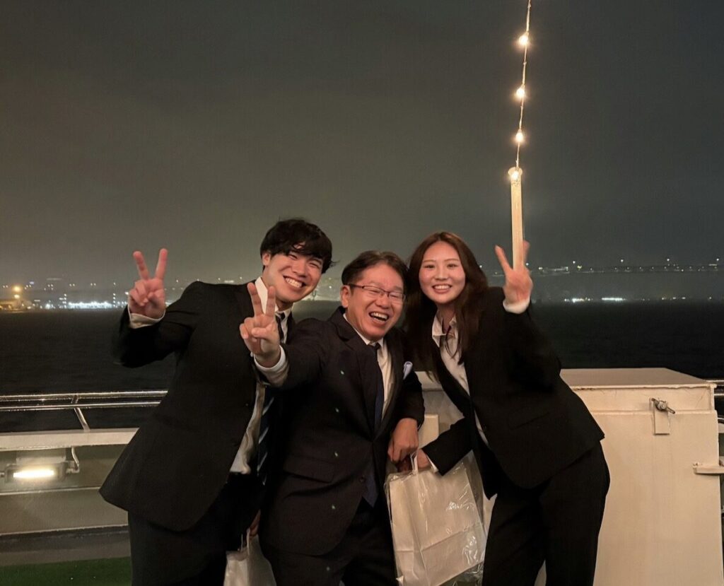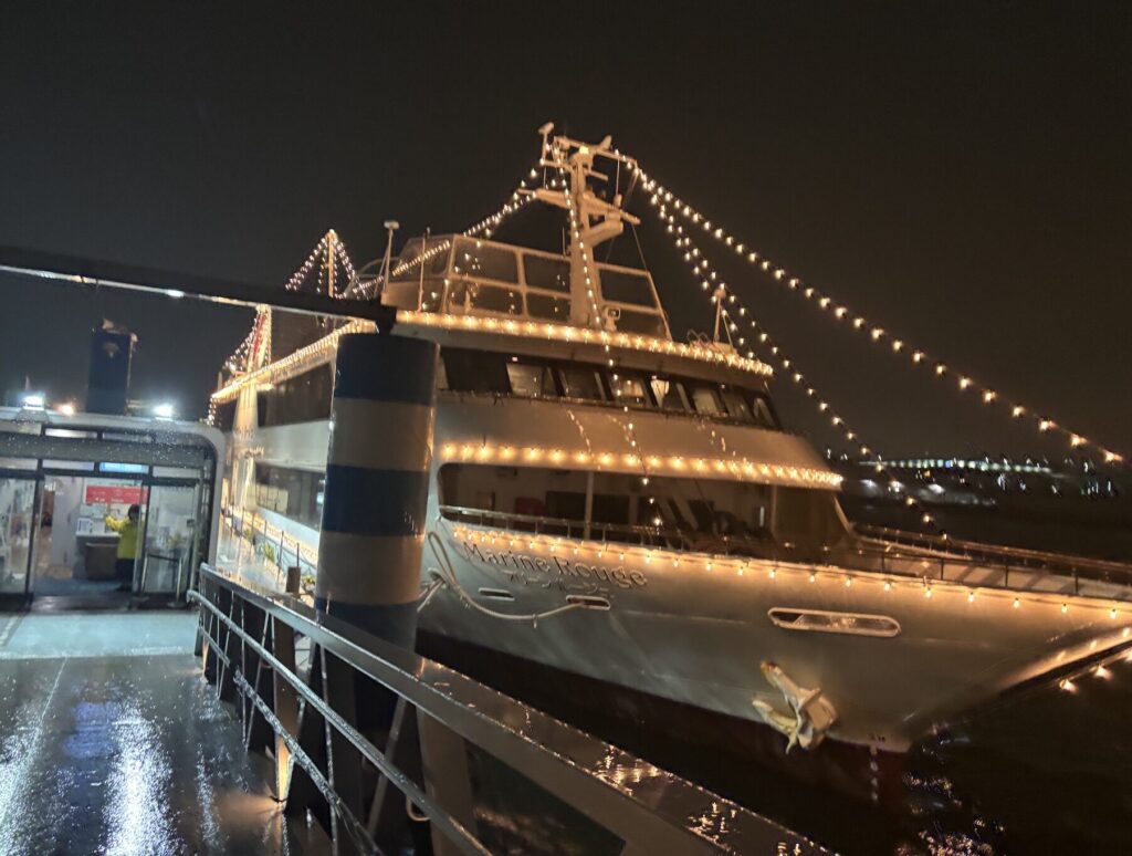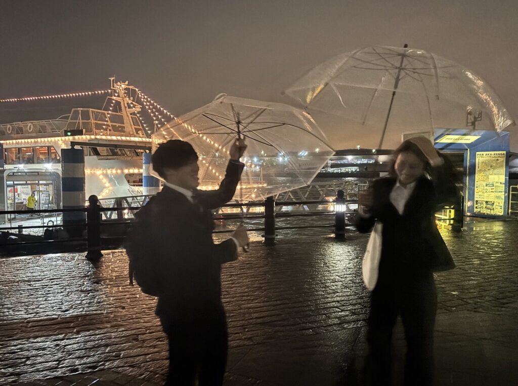 そうしているうちに横浜港ナイトクルーズの時間に遅れそうになり、学生たちがタクシーを手配してくれ、大雨の中ギリギリ出港に間に合いました。