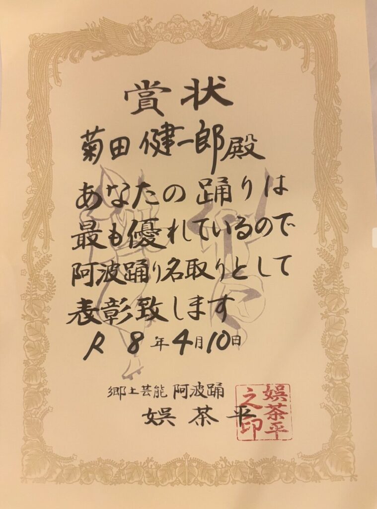 どういうわけか、阿波踊りの賞をいただきました。恥ずかしかったですが、この歳になって賞状をもらうことはないので嬉しかったです。。