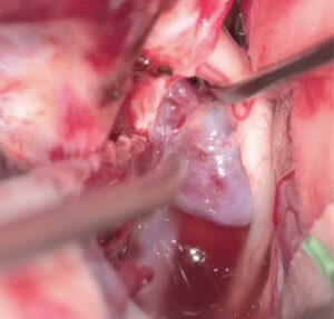 軽症SAHで、珍しい動脈瘤でした。直達術で行くとのことで、もしかしたらOA-PICAの可能性があったため指導に入りました。実際は動脈瘤はsacullar aneurysmで、川尻先生の見事な手術で綺麗にクリップされました。念の為ラッピングもしてもらいました。合併症なく治癒しました。