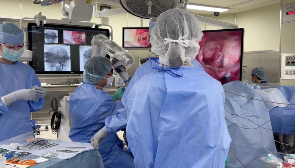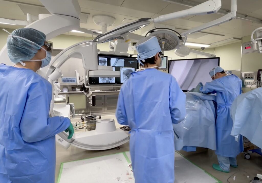 福井大学ではこの動脈瘤はルーチンにハイブリッド手術室を用いて、VEP、MEP、ICGのモニター下に術中DSAを用意して手術を行なっています。