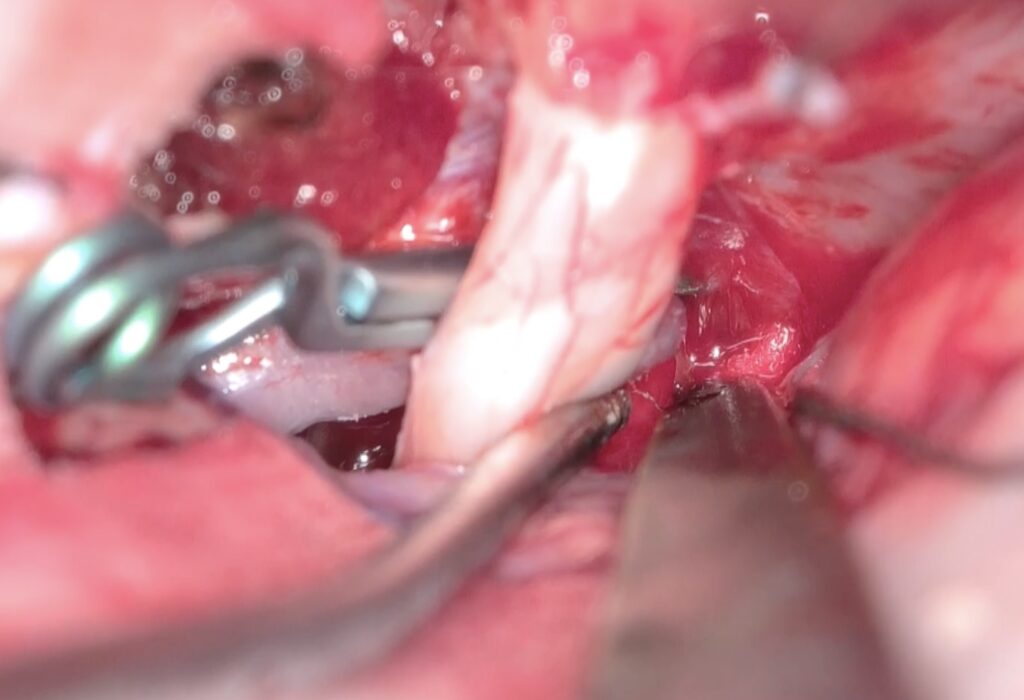 動脈瘤のドームは視神経を跨いでしましたので、視神経下面を通すようにクリップ。