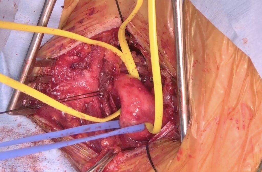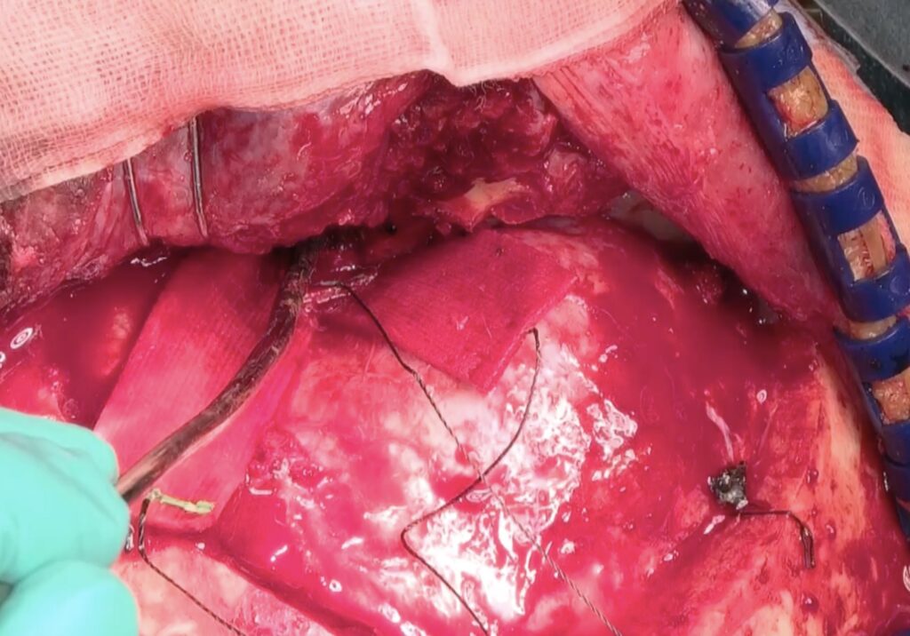 DSAを行ったのちに左前頭側頭開頭と左頸部内頸動脈を露出します。