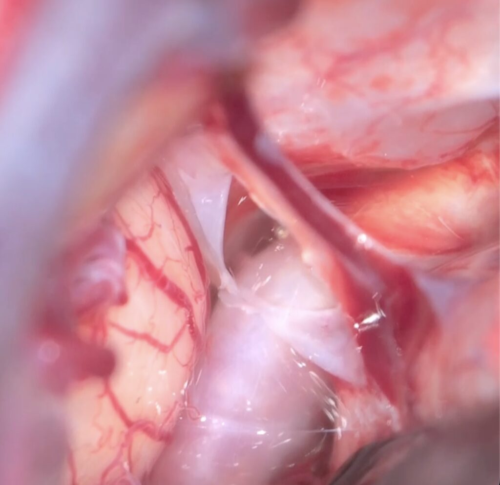 硬膜輪を開けて動脈瘤と眼動脈起始部を確認します。この際にすこし視神経を圧排しますのでVEPは必須です。