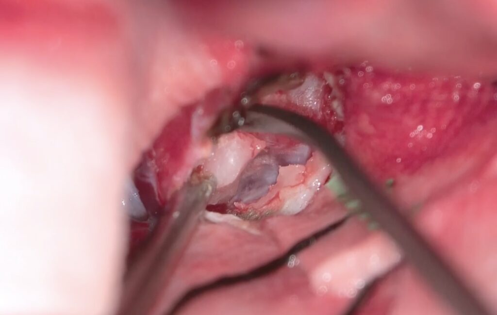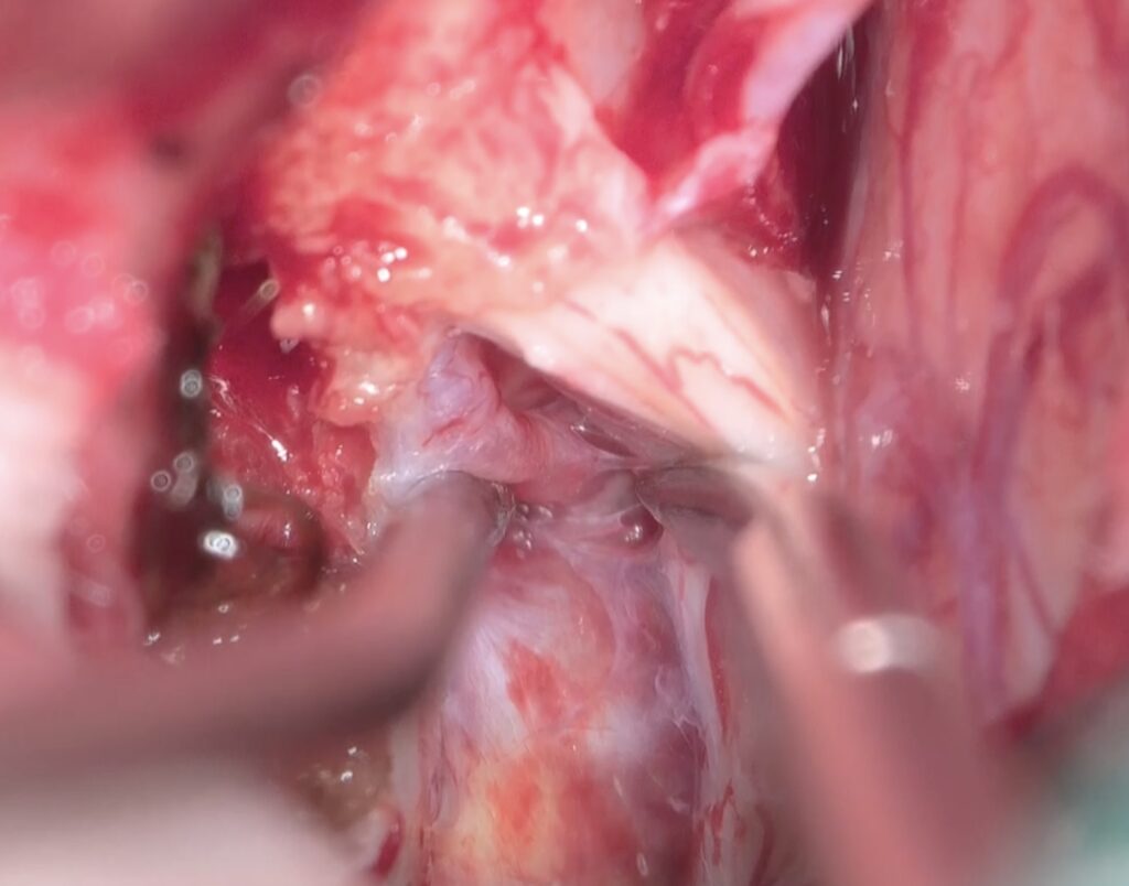 VEPでモニタリングしながら硬膜内から超音波骨削除器を用いて前床突起を完全に切除します。