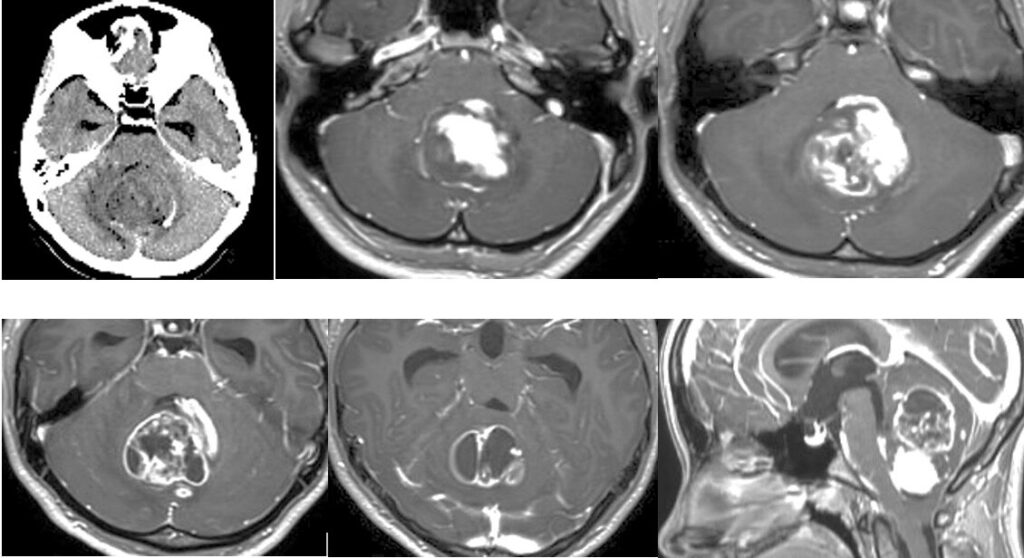 13歳小児の小脳腫瘍の摘出を行いました。術後失調や眼振が出ていましたが徐々に回復され大きな後遺症なく回復されました。よかったです。